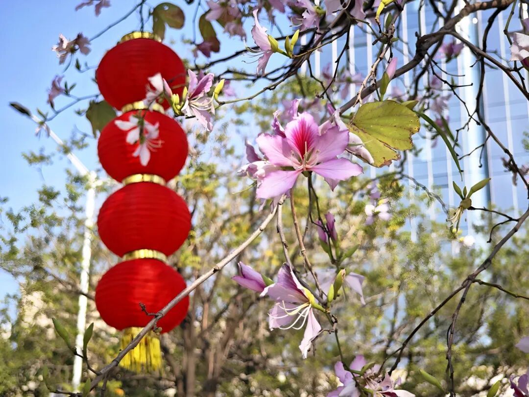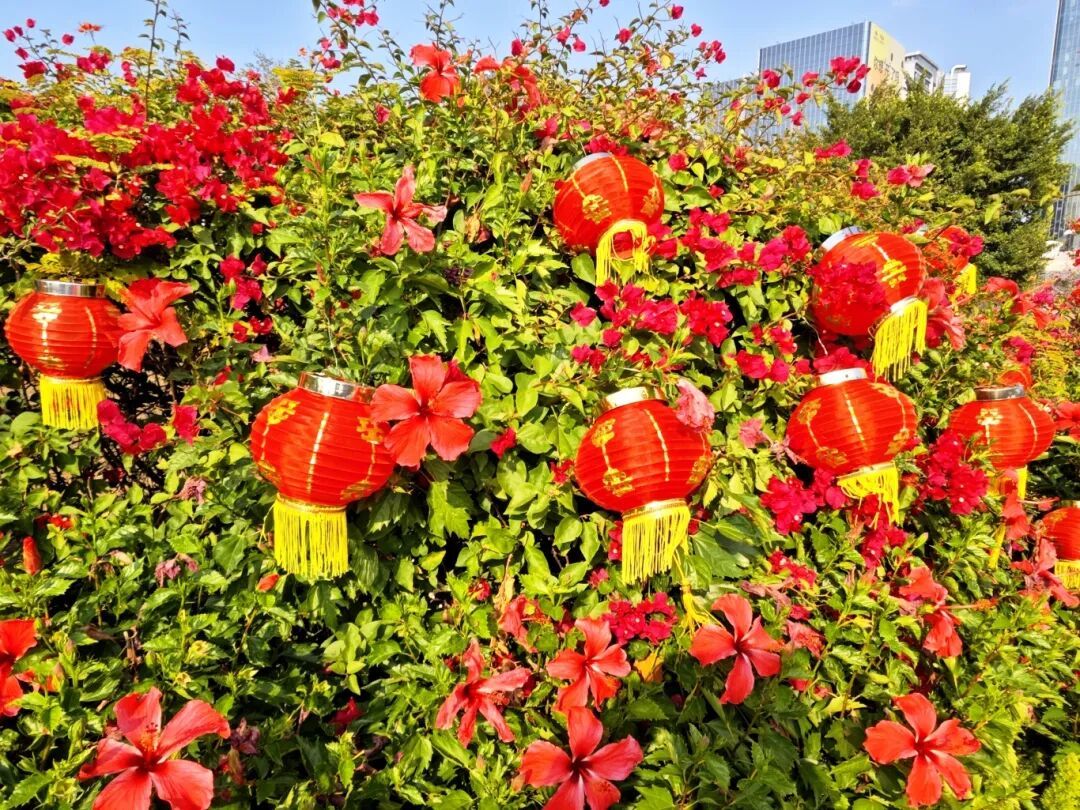 与繁花、灯笼交相辉映